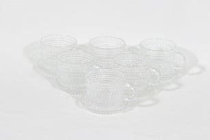 Nuutajärvi Kastehelmi kahvikupit ja lautaset, kirkas, 6 kpl, suunnittelija Oiva Toikka, pieni
