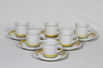 Arabia Faenza mokkakupit, keltainen, 6 kpl, suunnittelija Peter Winquist, raitakoriste