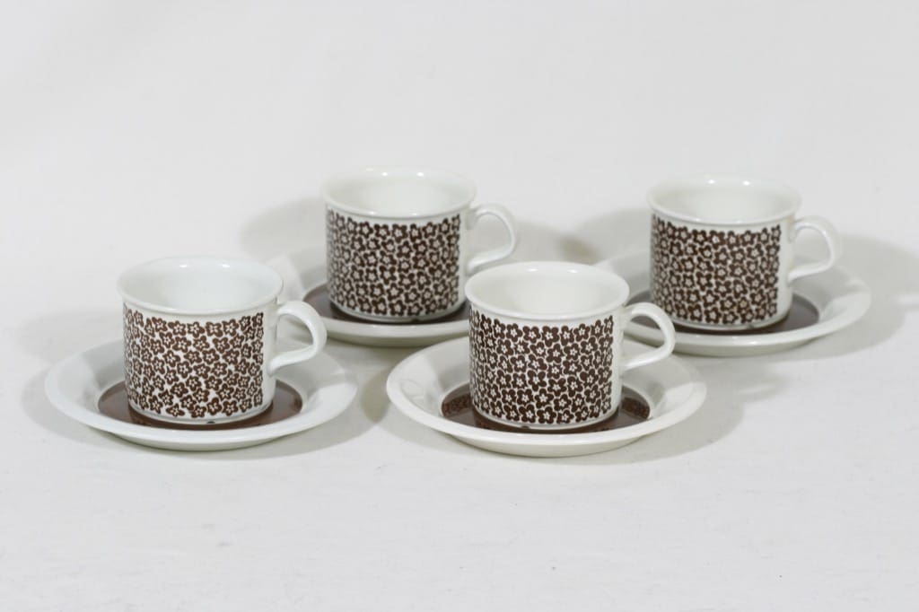 Arabia Faenza kahvikupit, ruskeakukka, 4 kpl, suunnittelija Inkeri Seppälä, ruskeakukka