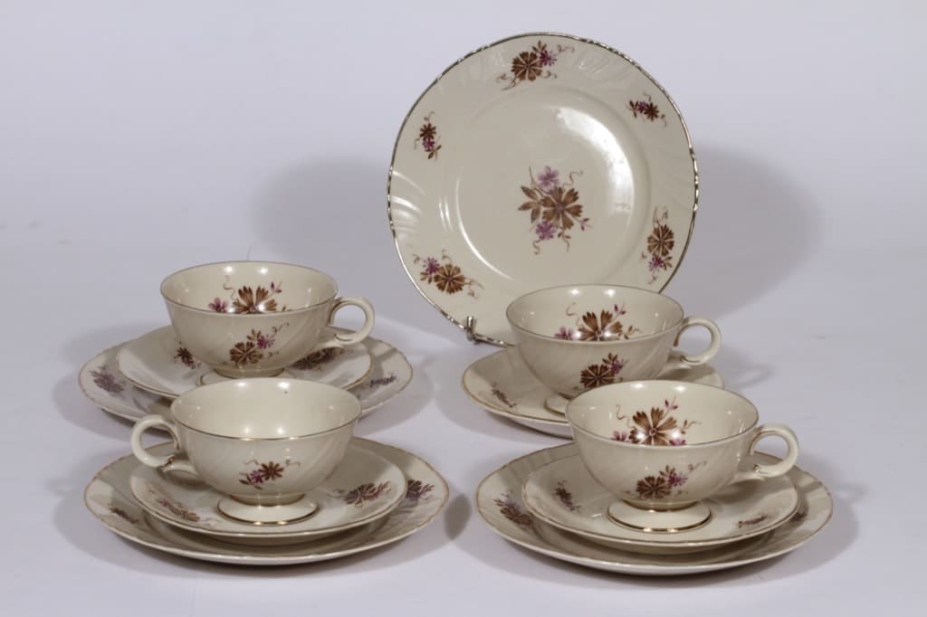 Arabia Raili kahvikupit ja leivoslautaset, 4 kpl, suunnittelija , serikuva, kukka-aihe, kullattu