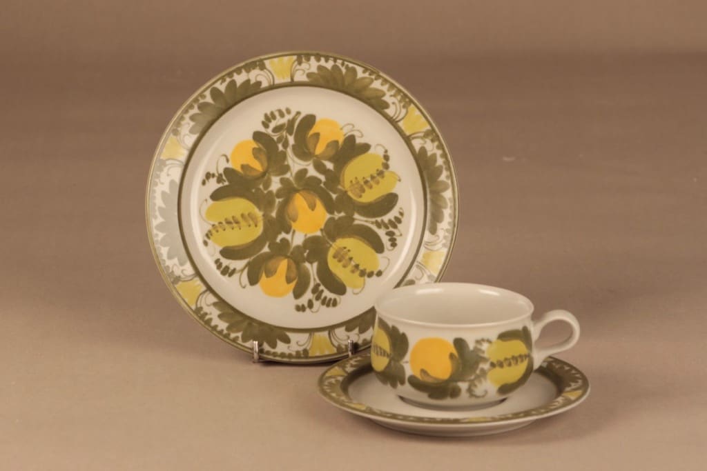 | Dimensions | Kuppi 8*9.5 sm, asetin halkaisija 16.5 cm, kakkulautasen 20 cm |
