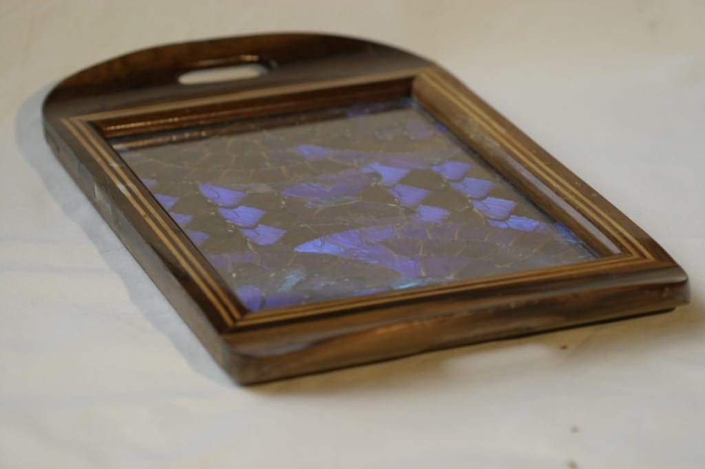 Näyttävä puinen perhosen siipi -tarjotin. Pohjassa merkintä: No Reg IBAMA 1/42/89/0195,4