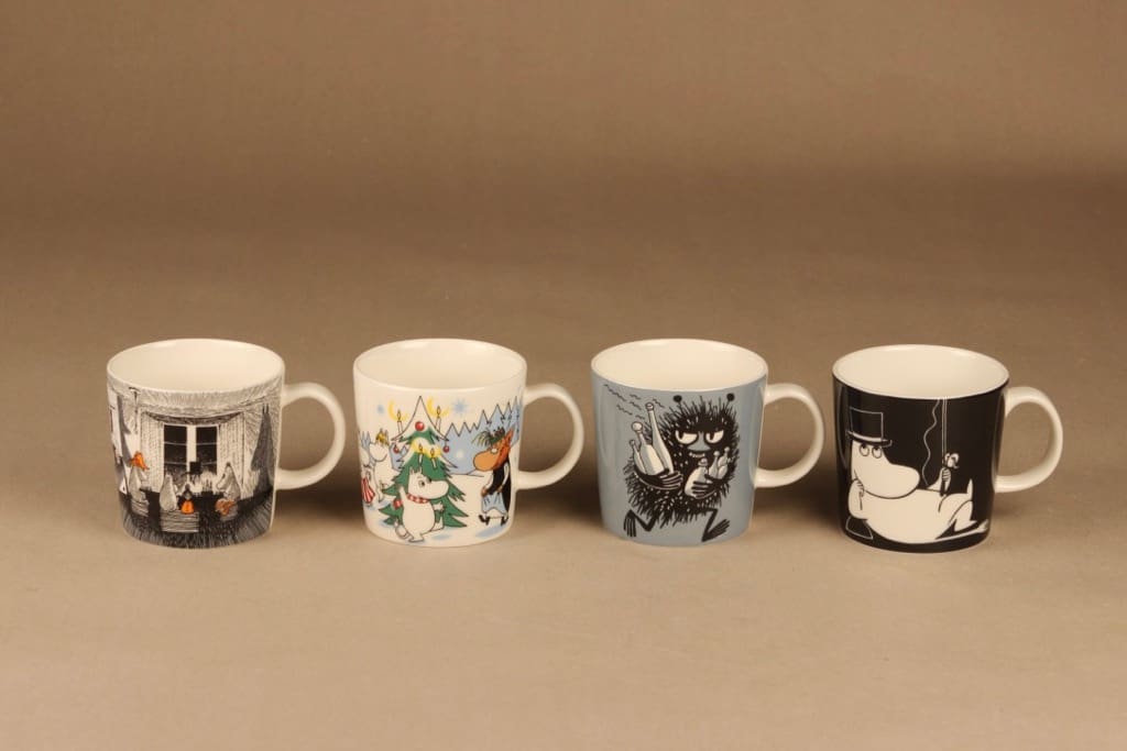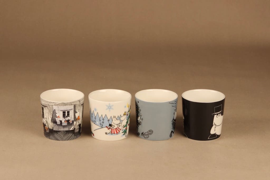 Included 4 mugs: Alkuperää kunnioittaen 2017, Kuusen alla 2013, Haisulu 2001- sekä Muumipappa tuumiskelee 1999-2013.
