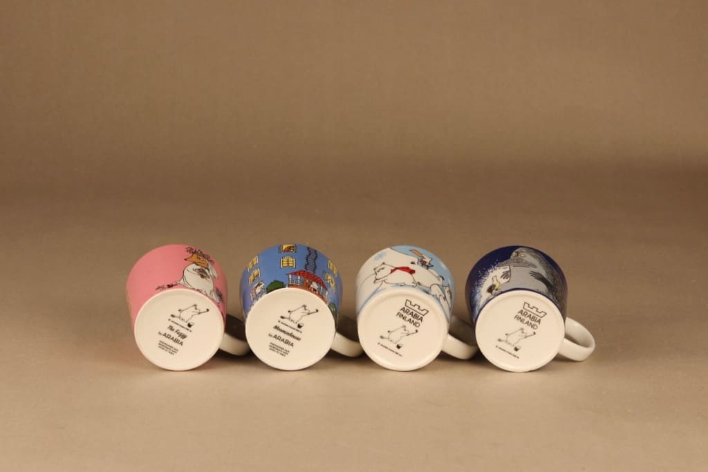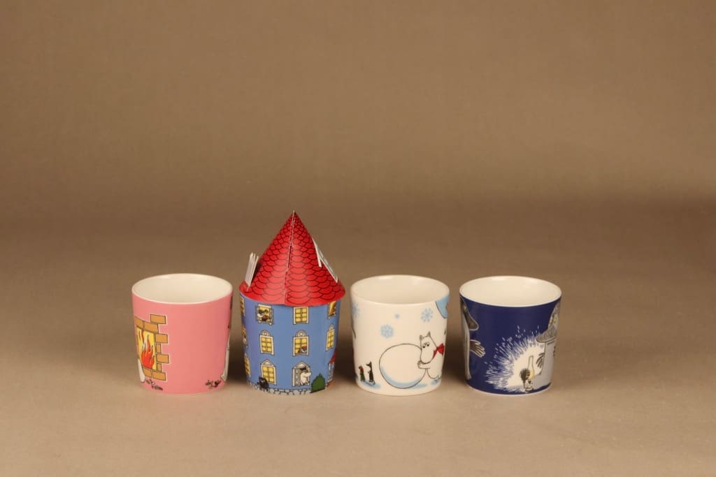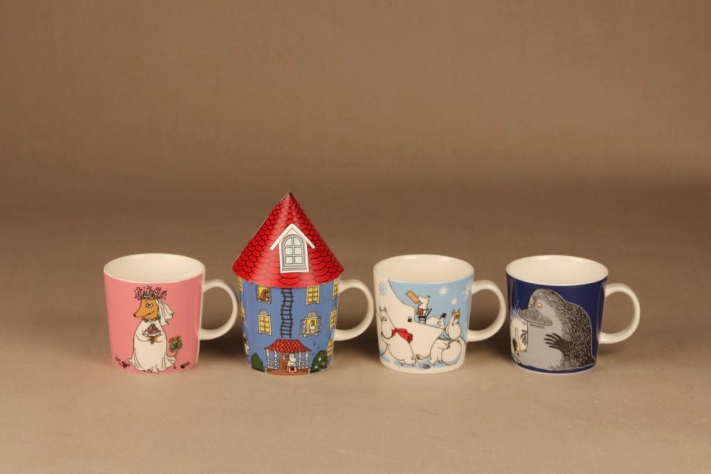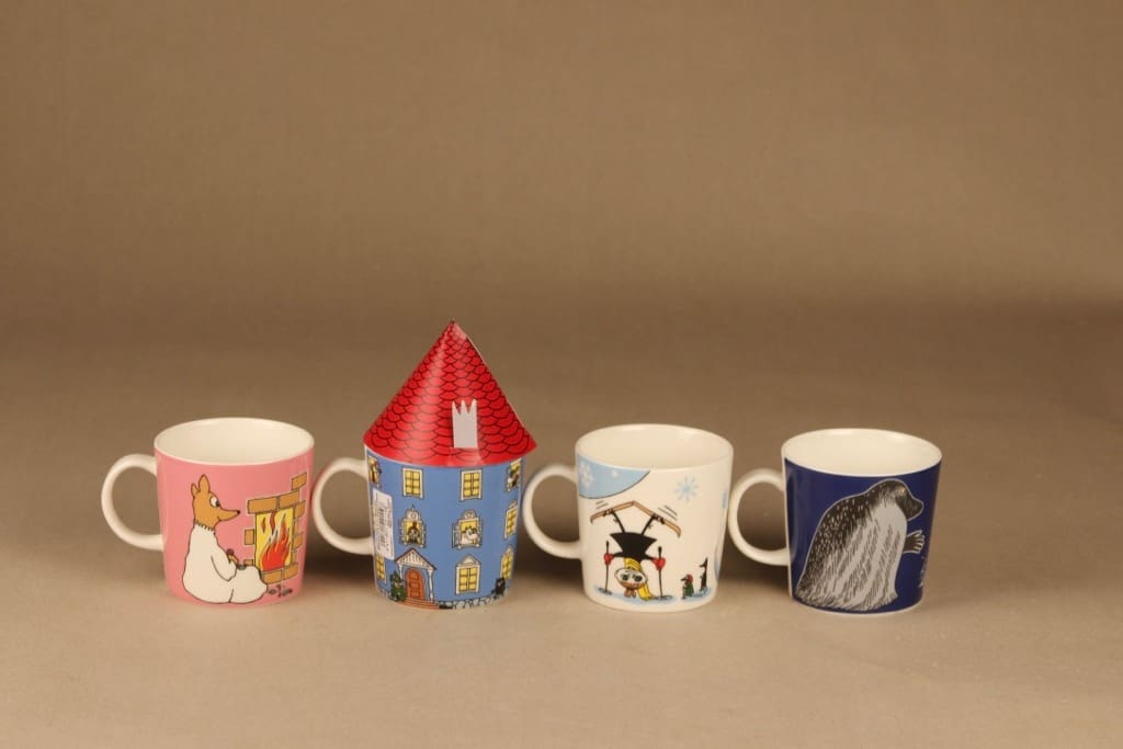 Included 4 mugs: Sosuli 2011-2019, Muumitalo 2015-, Lumileikkejä 2011 sekä Mörkö 2005-.