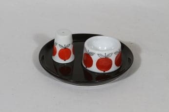 Alkuperäiskokonaisuus. Painettujen viivojen päälle maalattu koriste (ja sirottimen malli) Esteri Tomula. Munakuppi signeerattu.