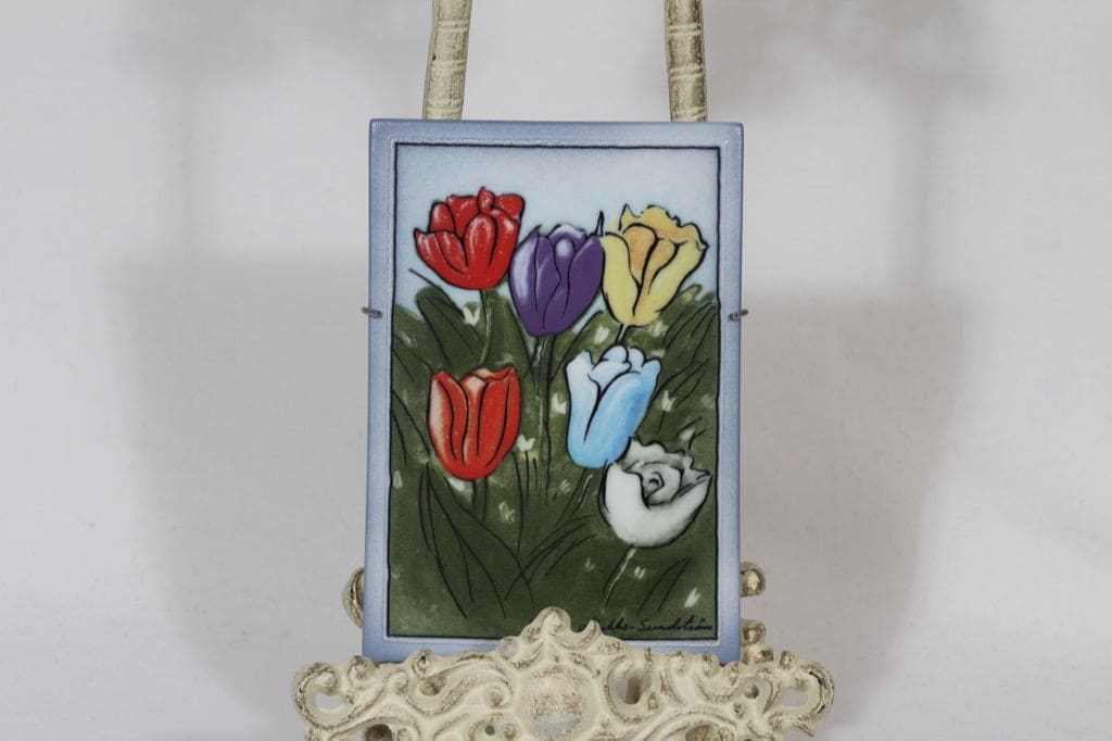 Arabia seinälaatta, Pienet tulppaanit, suunnittelija Heljä Liukko-Sundström, Pienet tulppaanit, pieni, serikuva, signeerattu