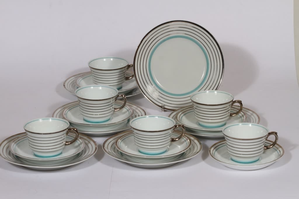 Arabia Raitahopea kahvikupit ja lautaset, 6 kpl, suunnittelija , raitakoriste, art deco