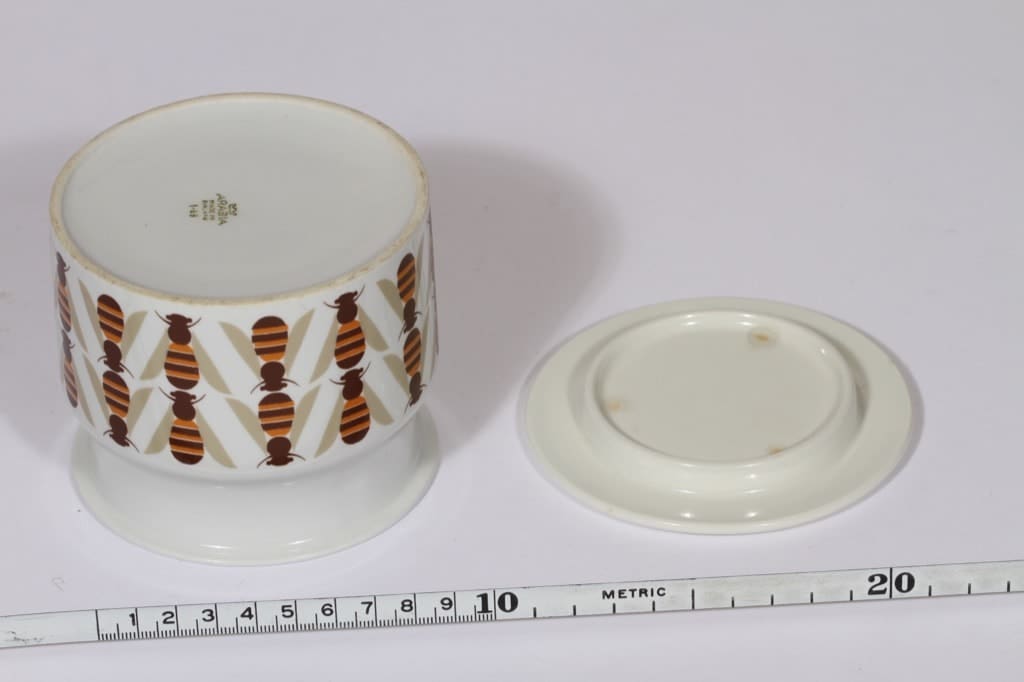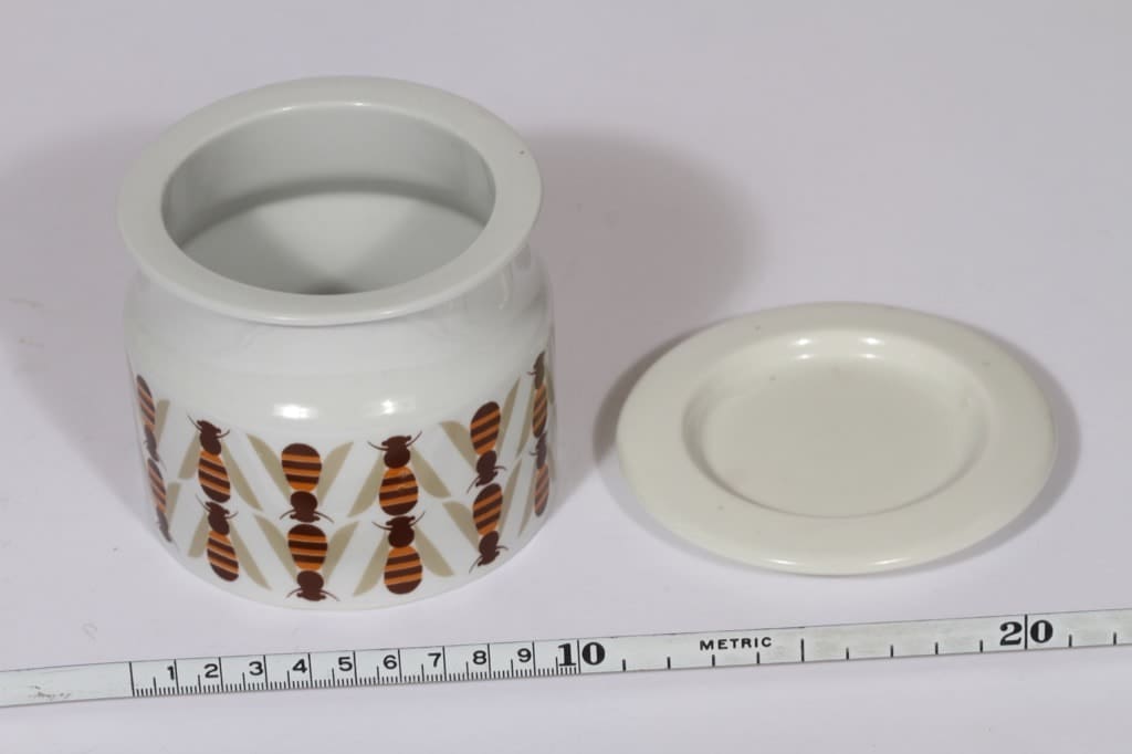 Koriste Raija Uosikkinen. Lasitteen kuivausjäljet kannen sisäpinnassa.