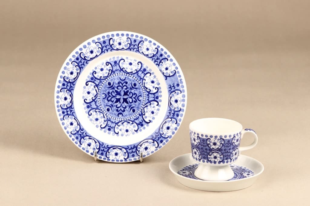 Kupin korkeus 6,7 cm, halkaisija 6,8 cm, asetin halkaisija 12 cm, Pullalautasen halkaisija 17,5 cm