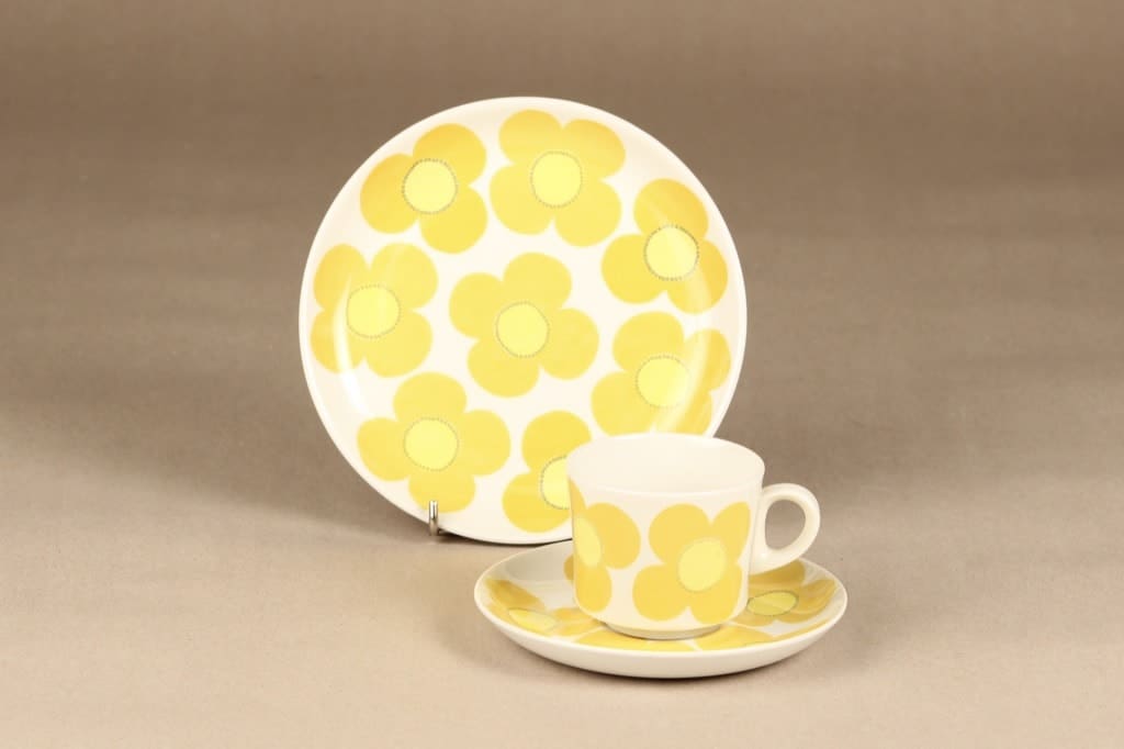 Kupin korkeus 6 cm, halkaisija 7 cm. Asetin halkaisija 13,5 cm, pullalautasen 17,5 cm.