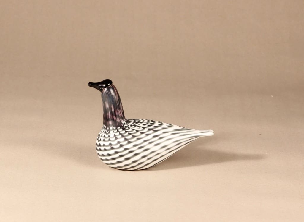 Nuutajärvi koristelintu, vaaleanharmaa, matta, harmaat raidat, tumma pää, suunnittelija Oiva Toikka,
