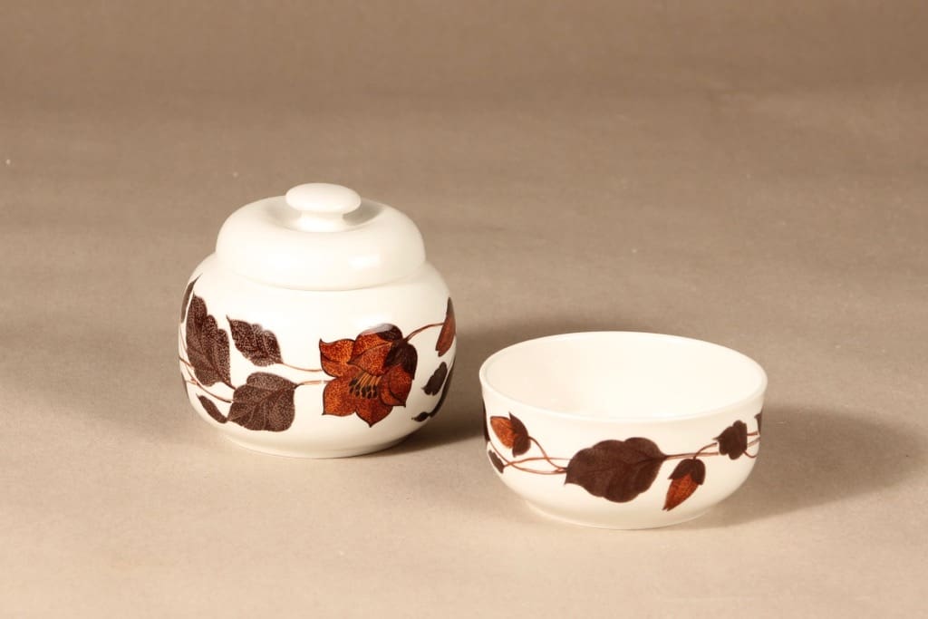 Arabia Tea for Two kulho ja sokerikko, ruskea, suunnittelija Gunvor Olin-Grönqvist, serikuva