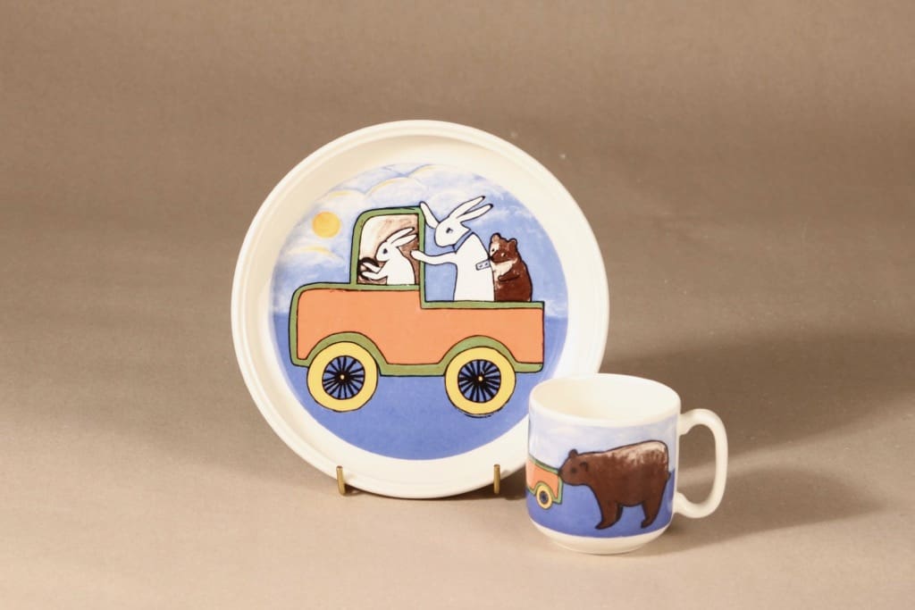 Arabia lautanen ja muki, Matkalla maailmalle, 2 kpl, suunnittelija Heljä Liukko-Sundström, Matkalla maailmalle, eläinaihe kuva 2