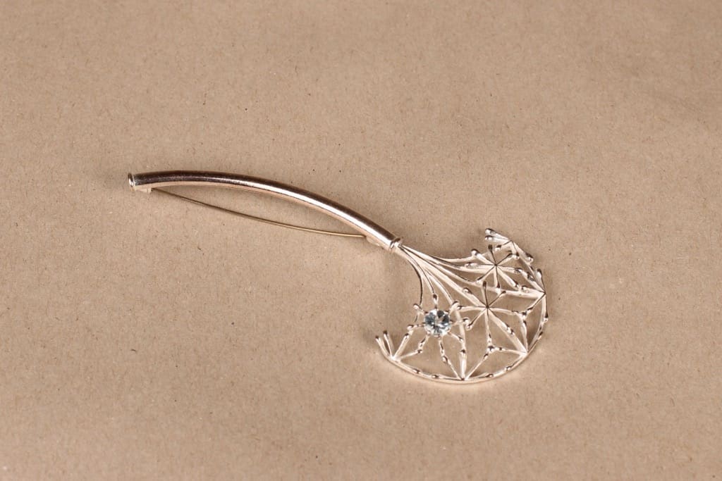 Kalevala Koru Naisen ääni rintakoru, hopea, suunnittelija Kirsti Doukas,