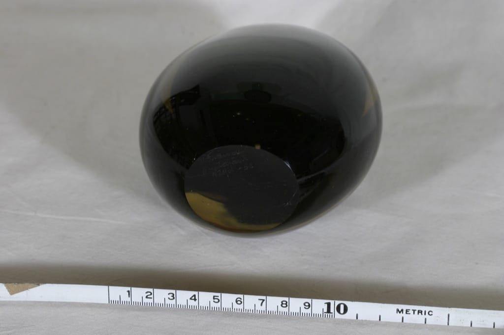Vähäisiä siirtelyjälkiä. Signeeraus ”K. Franck, Nuutajärvi Nötsjö -58” (lisäkuva). Esinettä valmistettu 10-14 cm korkeana ja myös punainen/harmaa -värisenä.