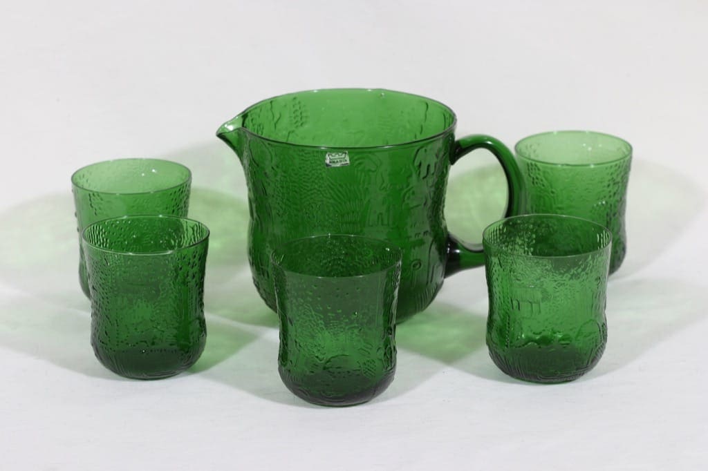 Nuutajärvi Fauna kaadin ja lasit, vihreä, 5 kpl, suunnittelija Oiva Toikka,