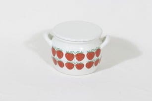 Arabia Pomona ruukku, mansikka, suunnittelija Raija Uosikkinen, mansikka, serikuva, retro